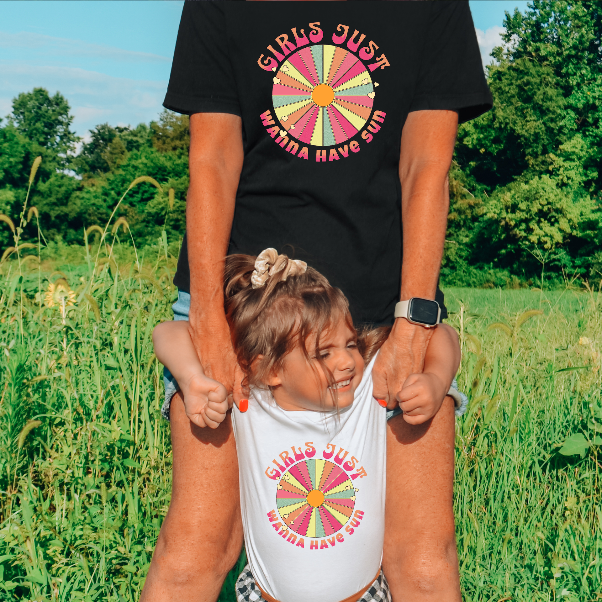 By wearing matching "Girls Just Wanna Have Sun" shirts, moms and their little ones can showcase their bond and shared love for sunny days. It's a delightful way to create lasting memories and capture the essence of summer fun together.